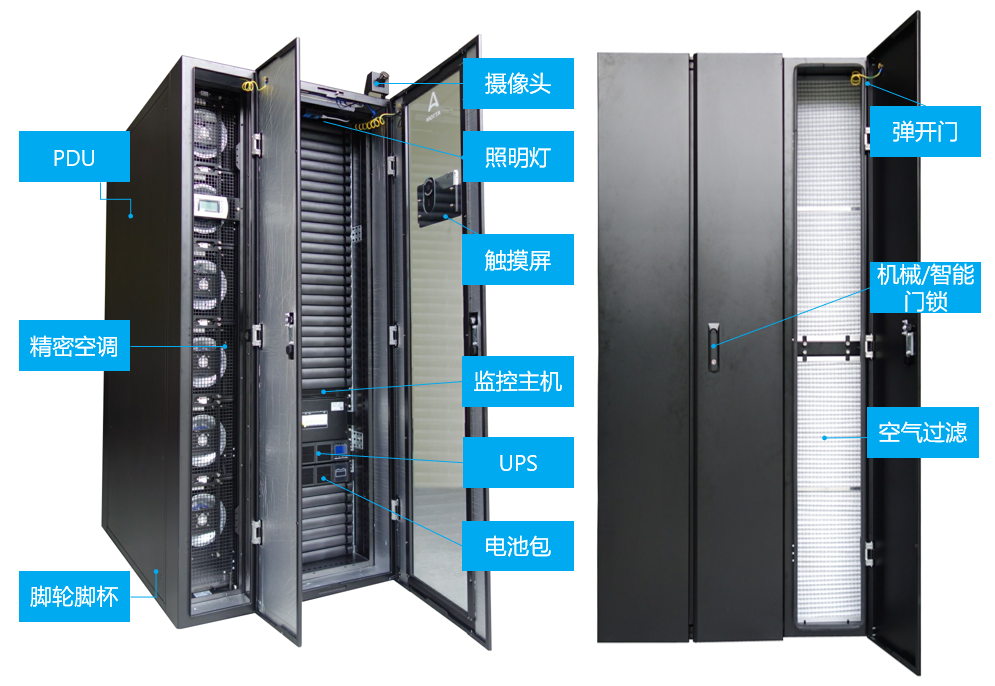l 一體化設(shè)計(jì)的小型模塊化數(shù)據(jù)中心產(chǎn)品,集成了IT設(shè)備運(yùn)行所需的主要物理基礎(chǔ)設(shè)施:機(jī)柜、UPS、蓄電池、配電、精密空調(diào)、動(dòng)力環(huán)境監(jiān)控、安防及消防等系統(tǒng);